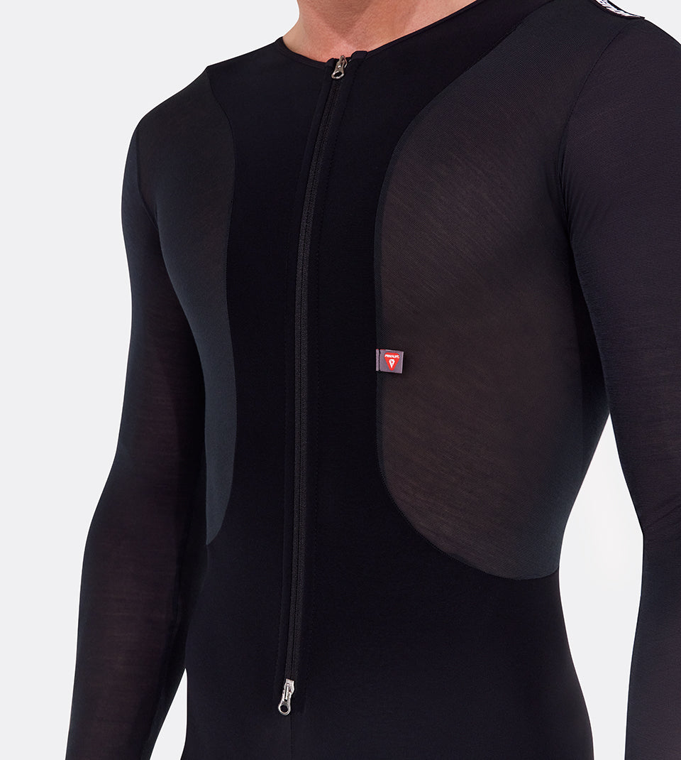 La partie supérieure présente une coupe innovante avec une couche de base à manches longues intégrée, conçue pour offrir un confort inégalé sous votre veste de cyclisme. Fabriqué en tissu Primaloft®, un tissage bi-composant qui favorise l'évaporation de la transpiration en améliorant la thermorégulation, il vous gardera au chaud et au sec.