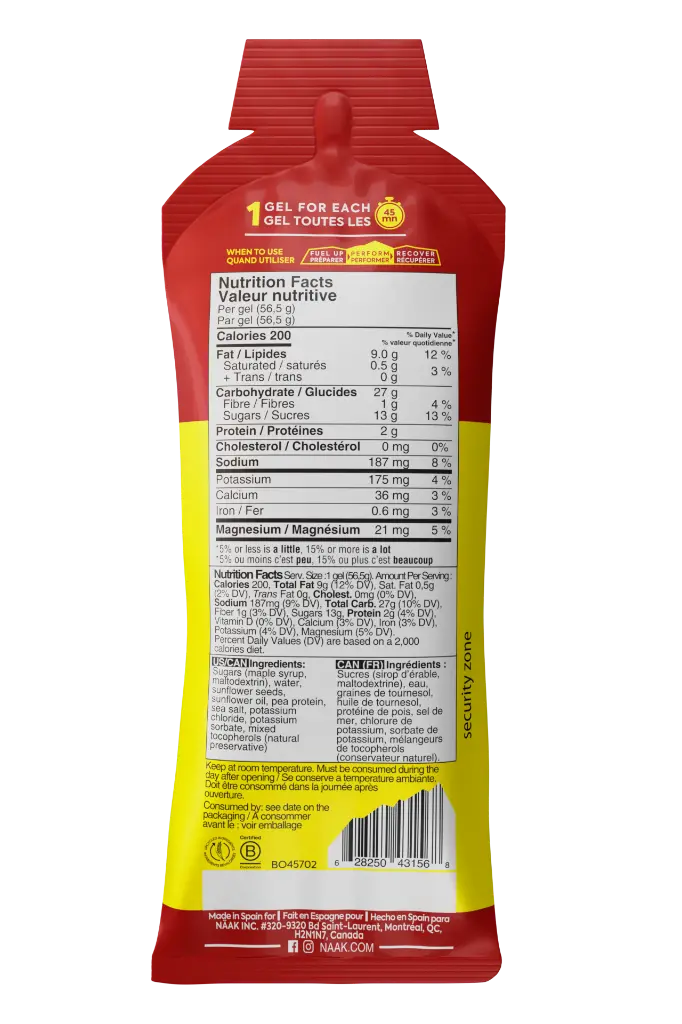 Conçu pour les efforts de très longue distance, le gel énergétique Näak Ultra Energy™ est spécialement formulé pour les tests d'endurance extrême. Composé à 37 % d'ingrédients recyclés, il apporte 200 calories et 35 mg de caféine par portion.
