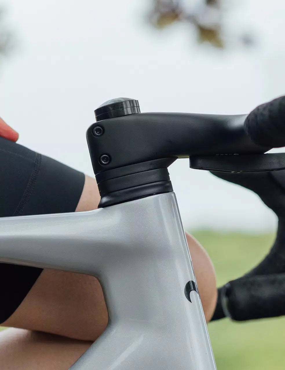 Cette combinaison de reach & stack nous permet d'avoir une position confortable sans utiliser d'entretoise entre la potence et le cadre. Combien de fois voit-on des cyclistes pédaler sur des vélos pur racing avec plusieurs centimètres d'entretoises sous le cintre ? Avec Granturismo SLR, le look du vélo est harmonieux, équilibré et racé malgré tout.