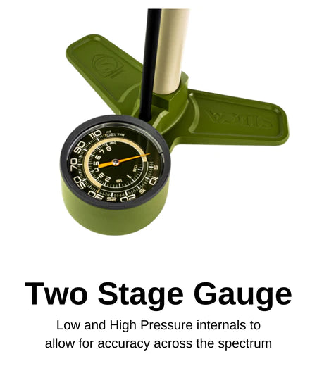 Utilisant une nouvelle technologie révolutionnaire d'échelle de jauge non linéaire, la pompe Terra utilise des composants internes de jauge personnalisés pour créer une jauge qui permet une précision de 0,5 psi à l'extrémité inférieure de la plage grimpant à une précision de 2 psi à l'extrémité supérieure de la plage (120 psi). Cette conception unique permet une jauge avec une capacité globale de 120 psi, mais 50 % de la face de la jauge contient 0-30 psi (0-2,1 bar).