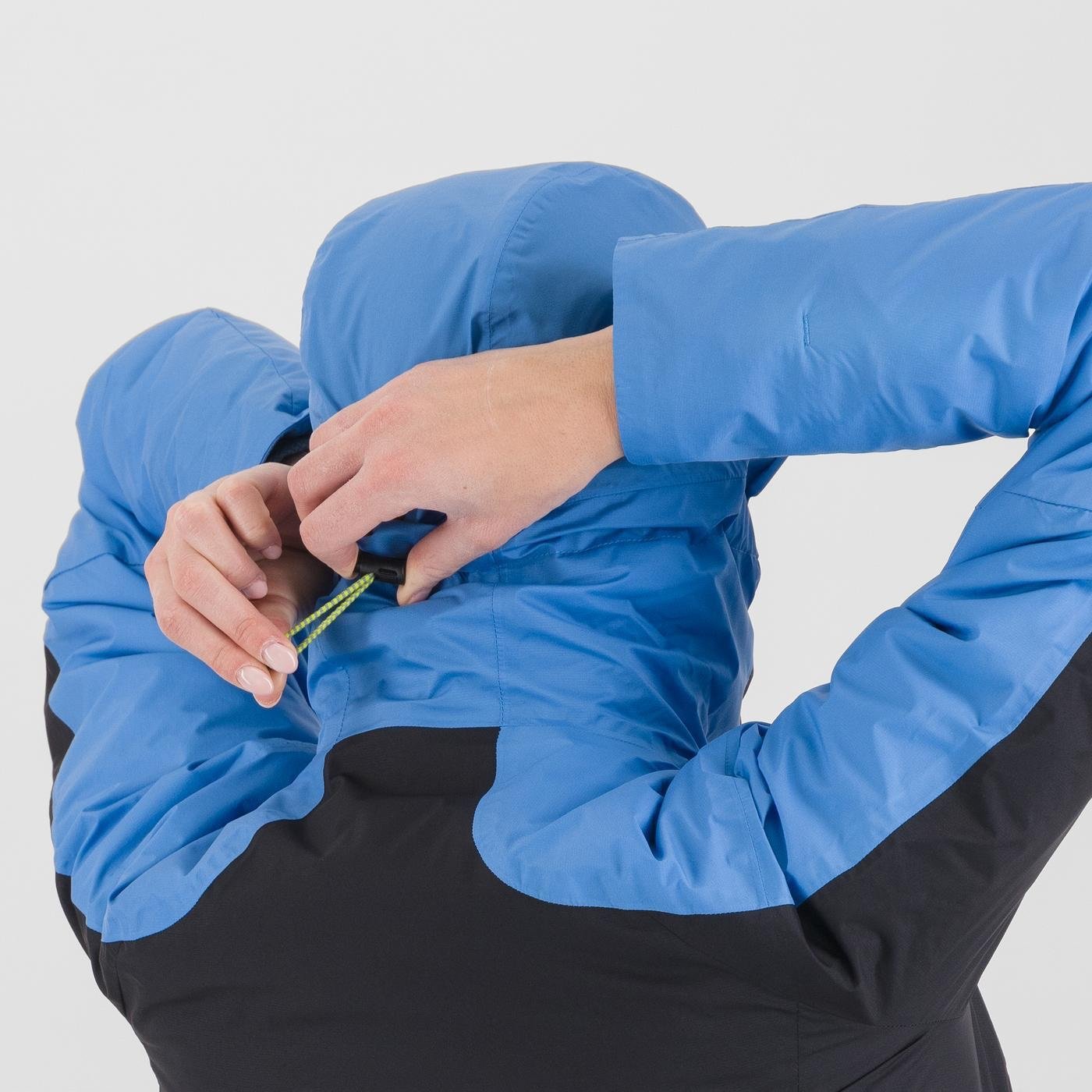 Cette veste est fabriquée avec une construction hybride ; le tissu K-Dry assure une imperméabilité équivalente à une colonne d'eau de 20 000 mm et une respirabilité de 70 000 g/m²/24 h, tandis que les empiècements en polaire thermique sur la capuche, les poignets, l'intérieur des manches et l'intérieur du dos offrent confort et chaleur. La chaleur est principalement assurée par l'isolation PrimaLoft® Silver Active : 100 grammes sur les manches et la capuche et 130 grammes sur le reste du vêtement.